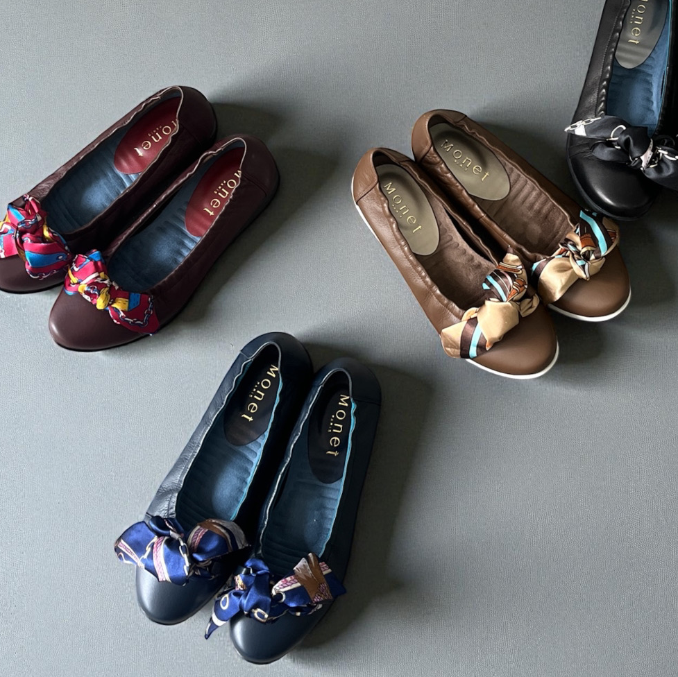 エレガントなスカーフリボンが特徴。普段使いからお出かけまで幅広く使える一足。